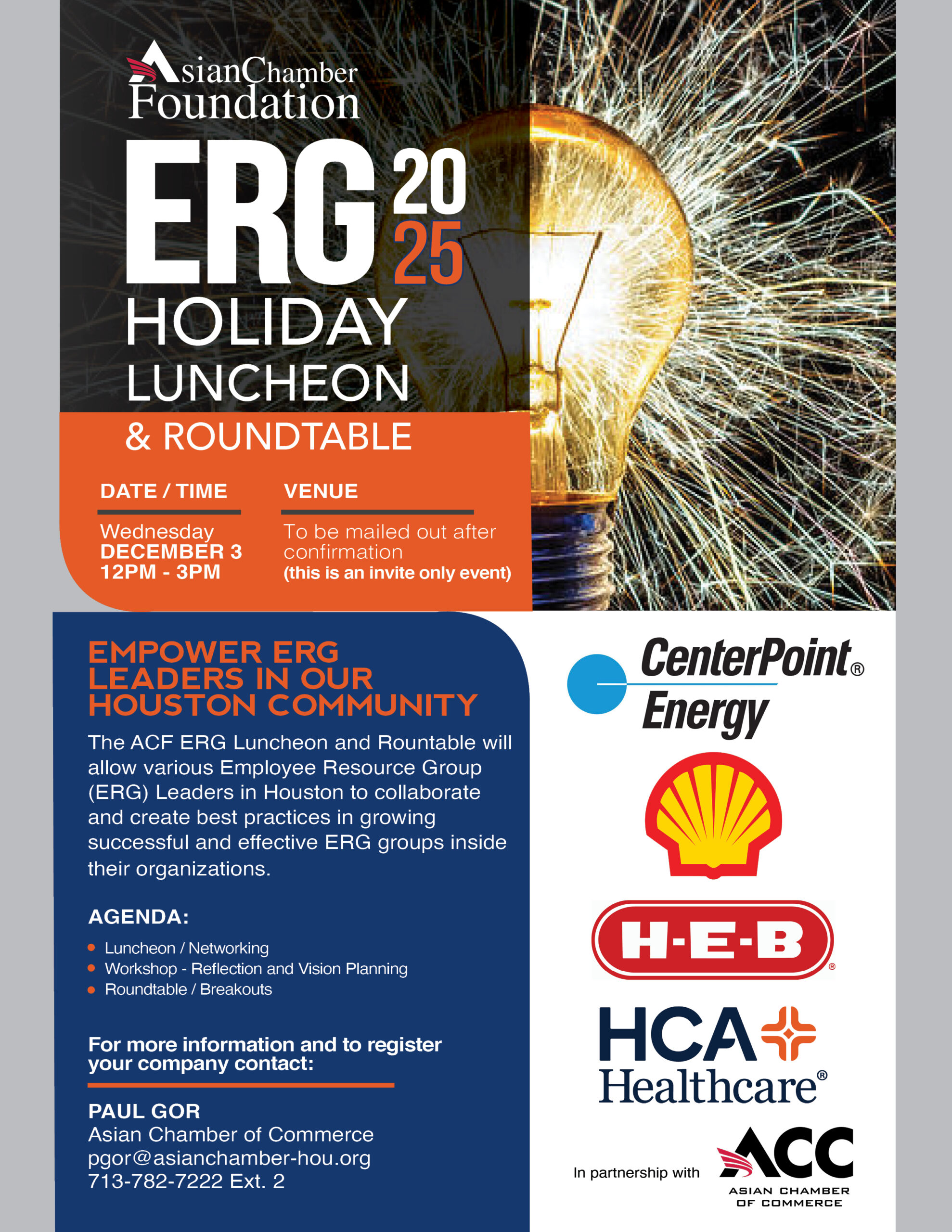 As we end 2025, The Asian Chamber Foundation will host a holiday luncheon and roundtable event to allow various Employee Resource Group (ERG) Leaders in Houston to collaborate and create best practices in growing successful and effective ERG groups inside their organizations. This is an invite-only event specifically for ERG Leaders.