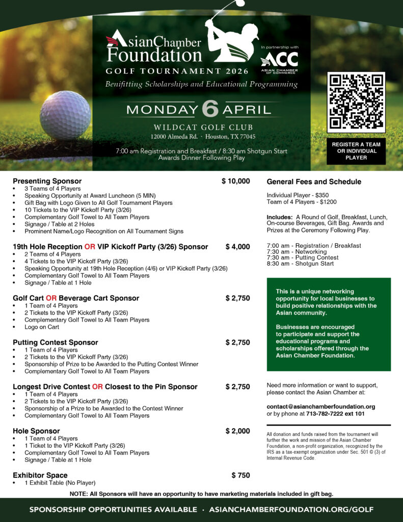 Our purpose is to bring together like-minded business owners and leaders in order to network with each other through a round of golf. We will be raising awareness of the Asian Chamber Foundation which supports educational programing towards our future business leaders in Houston. Take time to compete and support what we are doing to educate our community and future leaders.