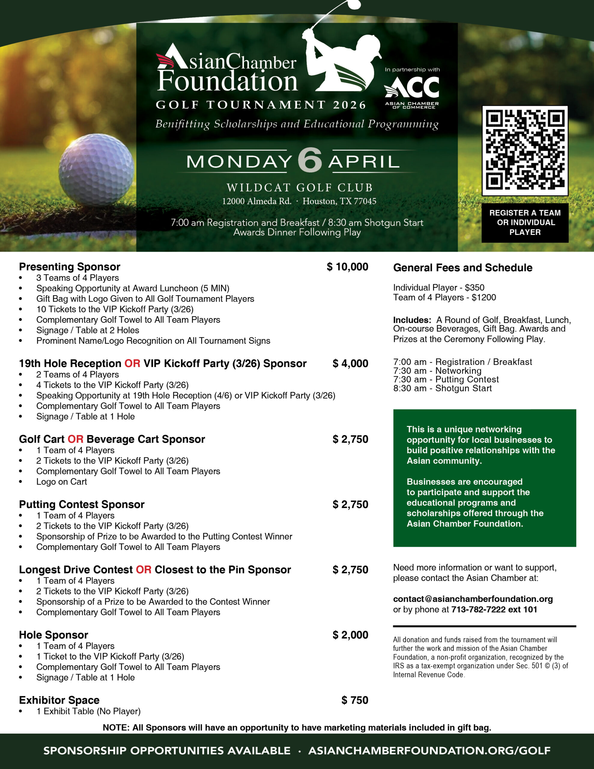 Our purpose is to bring together like-minded business owners and leaders in order to network with each other through a round of golf. We will be raising awareness of the Asian Chamber Foundation which supports educational programing towards our future business leaders in Houston. Take time to compete and support what we are doing to educate our community and future leaders.